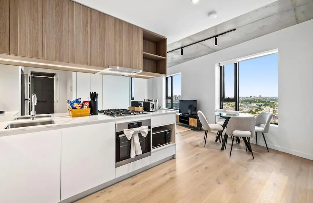 Stunning Stature Southbank 2Bedアパートメントは設備の整った台所が備わっており、そこで自炊することができます。 メルボルンから早朝便で出発する場合、宿泊はエッセンドン空港から20キロメートルほどの場所にあります。